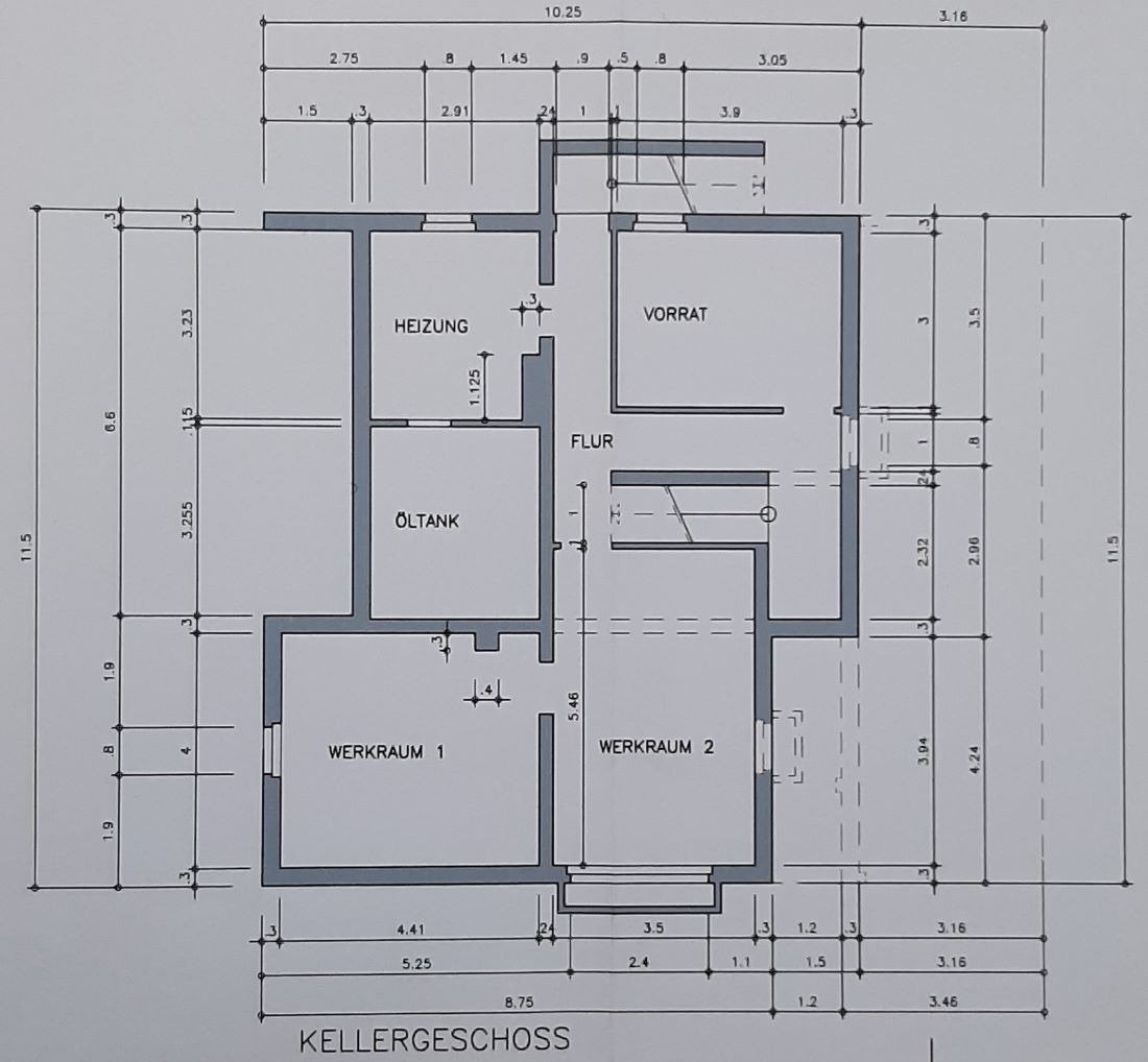 Sehr geräumiger, gepflegter und beheizter Keller (insgesamt 5 Räume: Werkräume/Lagerräume, Öltank, Vorratsraum und Heizungsraum mit Anschlüssen für Waschmaschine und Trockner).
